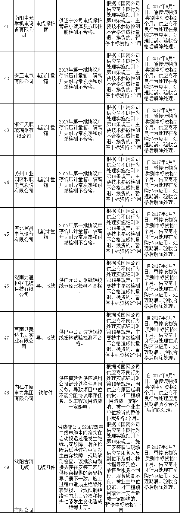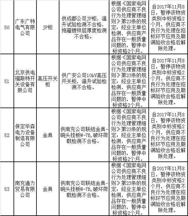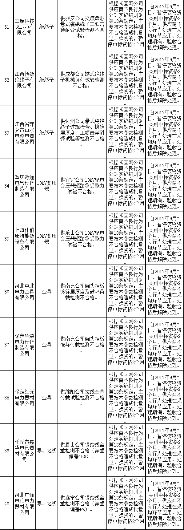 為促進供應(yīng)商誠信履約,保證產(chǎn)品質(zhì)量,確保電網(wǎng)建設(shè)順利進行及安全可靠供電,依據(jù)《國家電網(wǎng)公司供應(yīng)商不良行為處理管理細則》的有關(guān)規(guī)定,對出現(xiàn)產(chǎn)品質(zhì)量問題、履約不誠信等問題的供應(yīng)商進行了處理。具體處理情