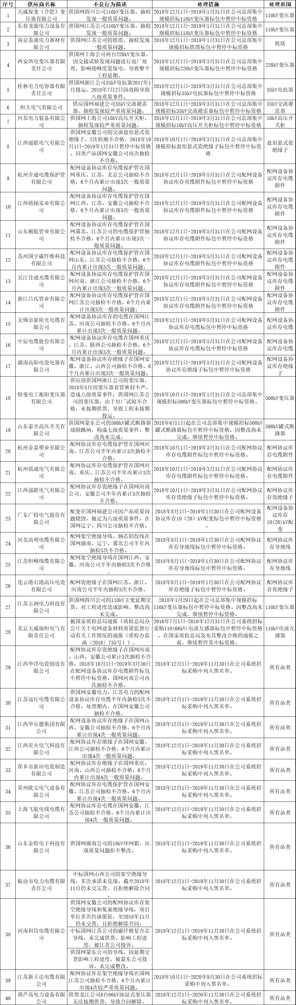 為促進(jìn)供應(yīng)商誠(chéng)信履約,保證產(chǎn)品質(zhì)量,確保電網(wǎng)建設(shè)順利進(jìn)行及安全可靠供電,國(guó)家電網(wǎng)依據(jù)《國(guó)家電網(wǎng)公司供應(yīng)商不良行為處理管理細(xì)則》的有關(guān)規(guī)定,對(duì)出現(xiàn)產(chǎn)品質(zhì)量問(wèn)題、履約不誠(chéng)信等問(wèn)題的供應(yīng)商進(jìn)行了處理。