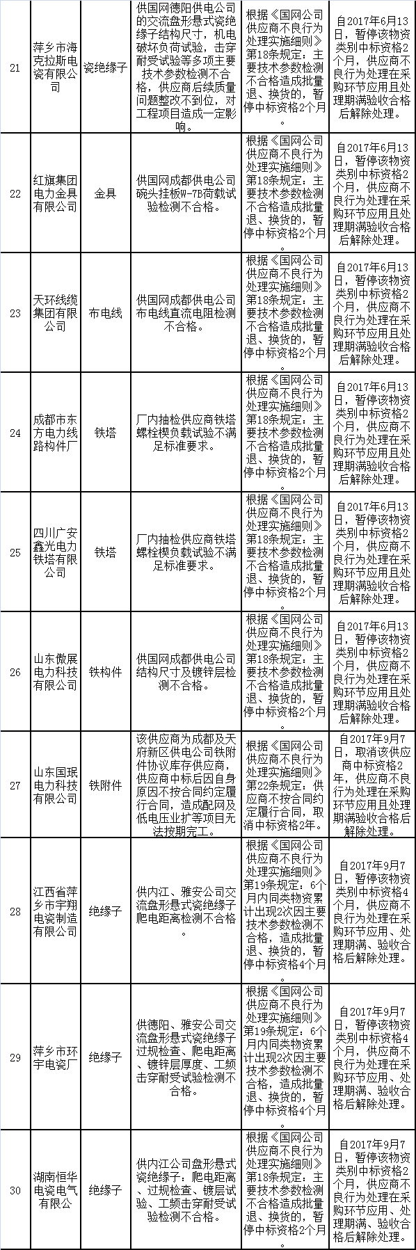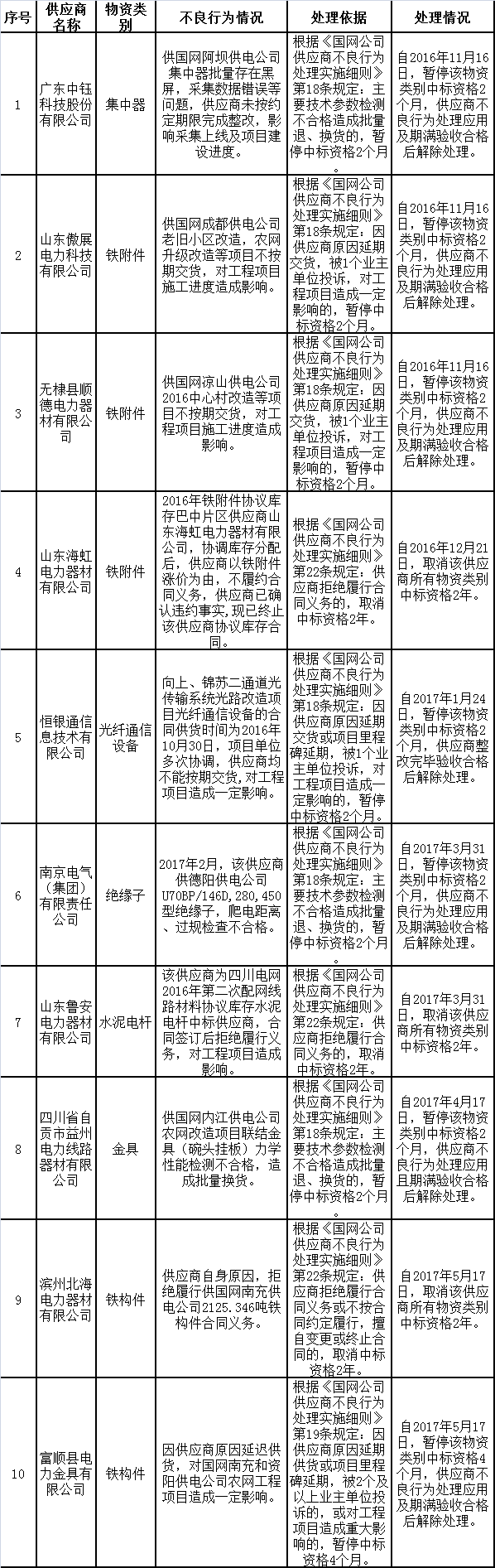 為促進(jìn)供應(yīng)商誠信履約,保證產(chǎn)品質(zhì)量,確保電網(wǎng)建設(shè)順利進(jìn)行及安全可靠供電,依據(jù)《國家電網(wǎng)公司供應(yīng)商不良行為處理管理細(xì)則》的有關(guān)規(guī)定,對出現(xiàn)產(chǎn)品質(zhì)量問題、履約不誠信等問題的供應(yīng)商進(jìn)行了處理。具體處理情況如下:
