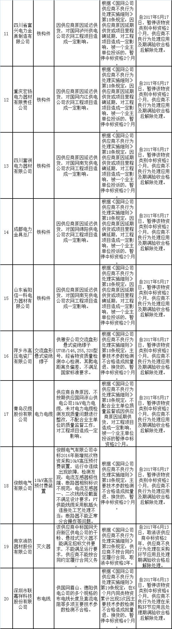 為促進(jìn)供應(yīng)商誠信履約,保證產(chǎn)品質(zhì)量,確保電網(wǎng)建設(shè)順利進(jìn)行及安全可靠供電,依據(jù)《國家電網(wǎng)公司供應(yīng)商不良行為處理管理細(xì)則》的有關(guān)規(guī)定,對出現(xiàn)產(chǎn)品質(zhì)量問題、履約不誠信等問題的供應(yīng)商進(jìn)行了處理。具體處理情